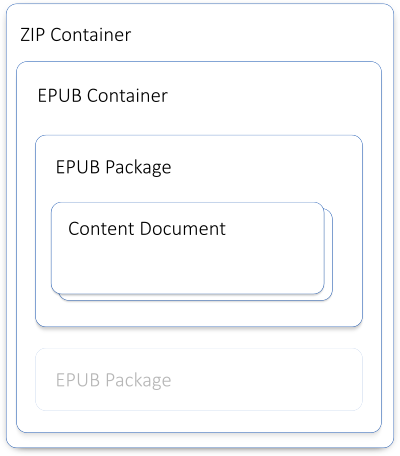 The EPUB file is actually a zip archive that can contain one or more renditions of a Publication. A high-level overview of the EPUB file format is presented in the illustration below.